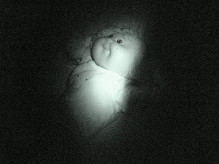 Okay, so you may not know this, but I've spent the last few days with a sore tooth. A botched root canal got infected and I've been in a good deal of pain since Saturday. So I've spent a lot of time in a dark room sleeping. Since my camera has this cool night vision feature, I thought that I would put it to the test to see how good it did in pitch black conditions. So, here it is. :) Oh yeah, this is my cabbage patch kid "Nora" that I've had forever. Sevrine claims her now, but she gave her to me to sleep with last night because I wasn't feeling good. Gotta love my girl.